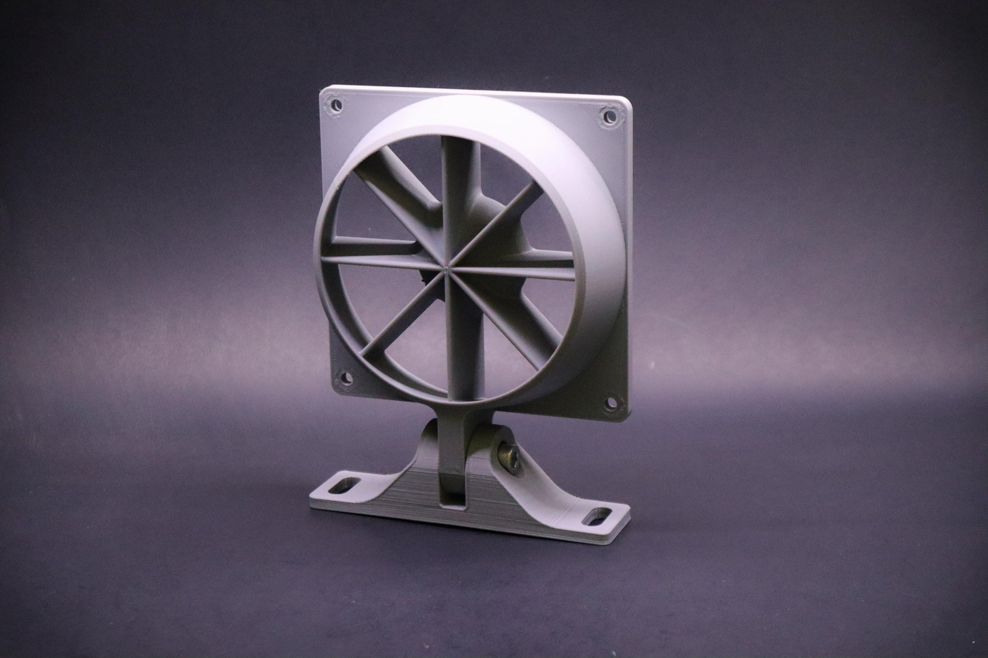 Mounting kit for 120mm fans with included mount for aluminum sim racing and flight simulator aluminum profile cockpits. Fan mount swivels and is fully adjustable. Base is slotted for some adjustability as demonstrated in photos.